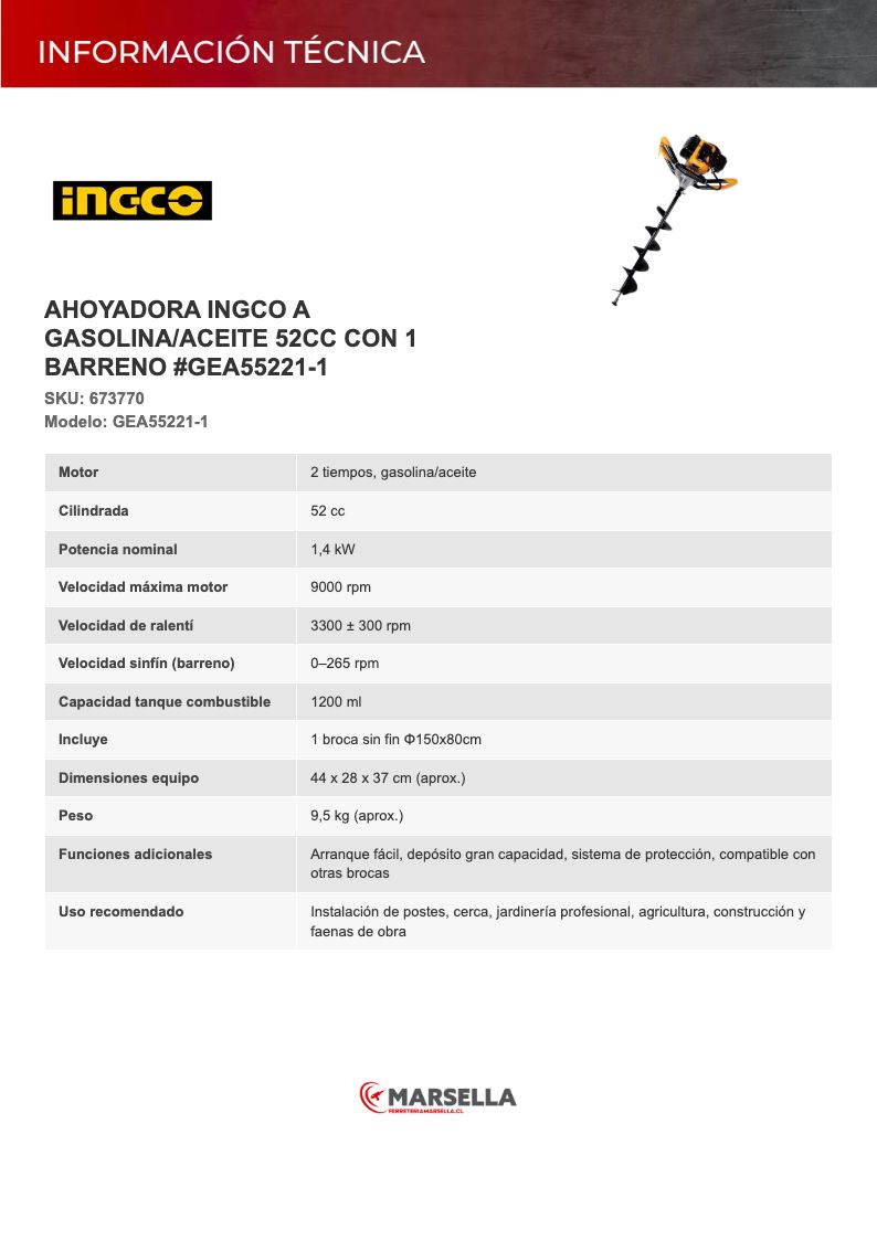 La ahoyadora INGCO GEA55221-1 es una herramienta a gasolina eficiente para perforar suelo en proyectos de construcción, paisajismo, instalación de postes, reforestación y horticultura. Equipa motor de 2 tiempos de 52cc y potencia de 1,4 kW, capaz de alcanzar hasta 9000 rpm. Incluye 1 broca sin fin Φ150x80cm para perforaciones de alto rendimiento y precisión. Depósito de combustible de 1200ml, arranque fácil y ergonomía mejorada. Compatible con brocas adicionales/alternativas, fácil manipulación y reparación.