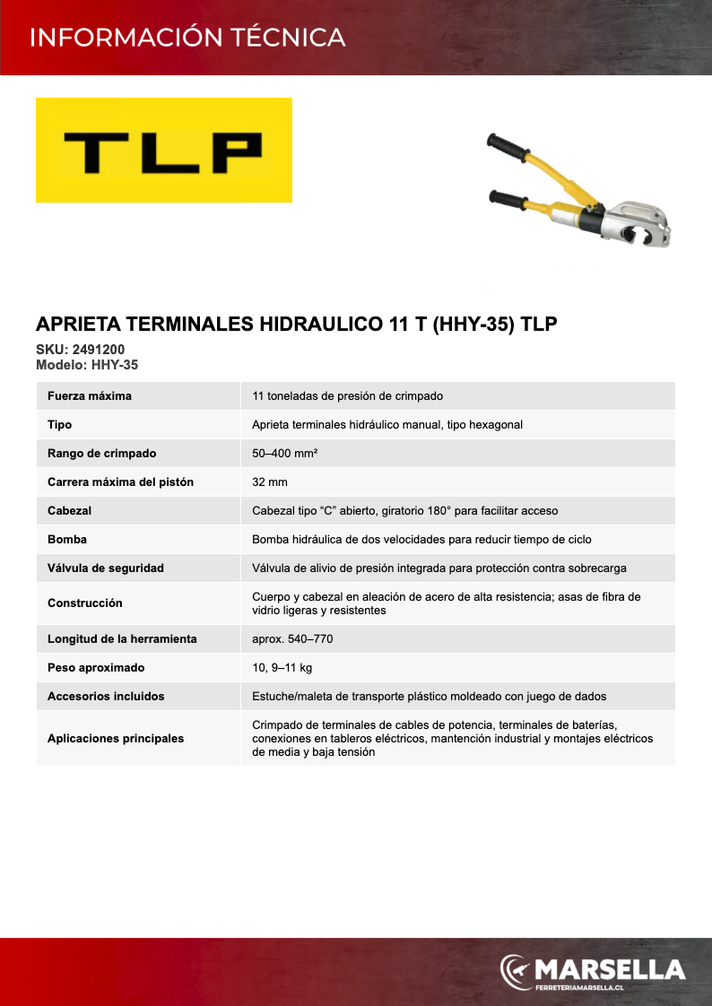 El aprieta terminales hidráulico TLP HHY-35 de 11 toneladas es una herramienta manual de crimpado diseñada para prensar terminales de cobre y aluminio en cables de potencia, ideal para trabajos eléctricos industriales y de mantenimiento donde se manejan secciones de conductor grandes. Ofrece crimpado de tipo hexagonal en un rango de 50–400 mm², por lo que cubre la mayoría de terminales de alimentación, barras flexibles y conexiones de baterías en tableros y campo. Incorpora bomba hidráulica de dos velocidades, cabeza tipo “C” giratoria 180° y dispositivo de seguridad con válvula de alivio, facilitando el acceso en espacios reducidos y asegurando un apriete uniforme y seguro.