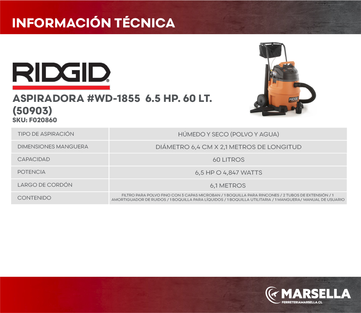 La Aspiradora RIDGID WD-1855 es una potente aspiradora industrial equipada con un motor de 6.5 HP y un tanque de gran capacidad de 60 litros, ideal para aspirar polvo, lquidos y residuos en ambientes profesionales y exigentes. Su diseo robusto y eficiente permite un rendimiento superior en talleres, construccin y mantenimiento industrial, facilitando la limpieza profunda y continua.