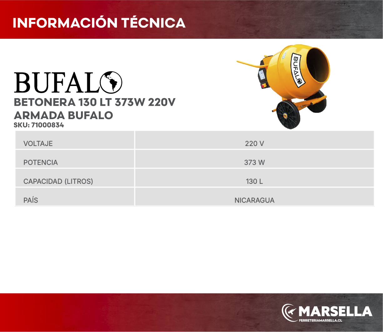 La Betonera Búfalo 130 litros 373W 220V armada combina potencia, eficiencia y durabilidad en un diseño compacto, ideal para trabajos de construcción liviana, remodelaciones y tareas domésticas. Su tambor de acero de 130 litros ofrece una capacidad óptima para preparar concreto, mortero o mezclas similares con gran homogeneidad.