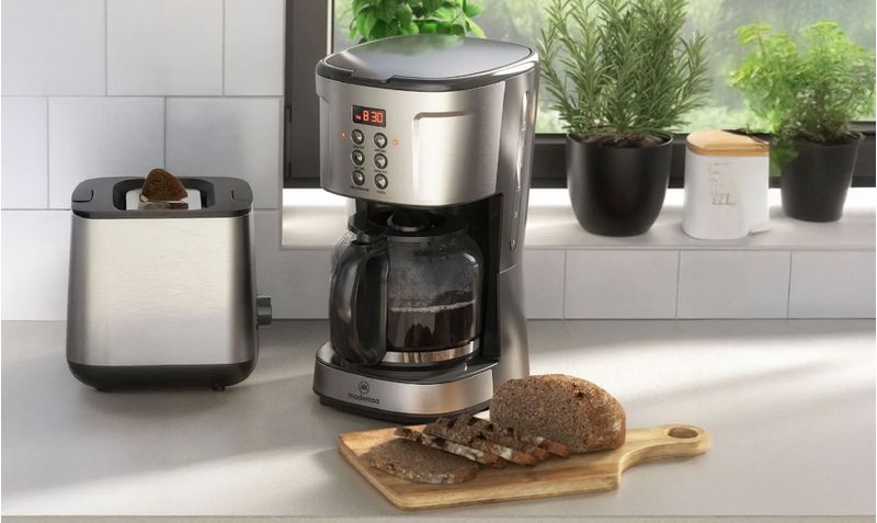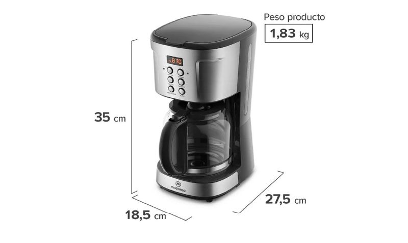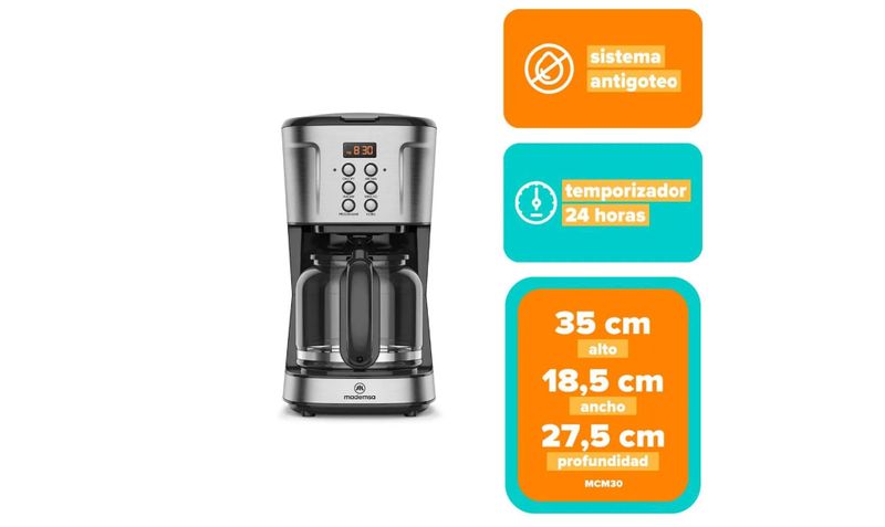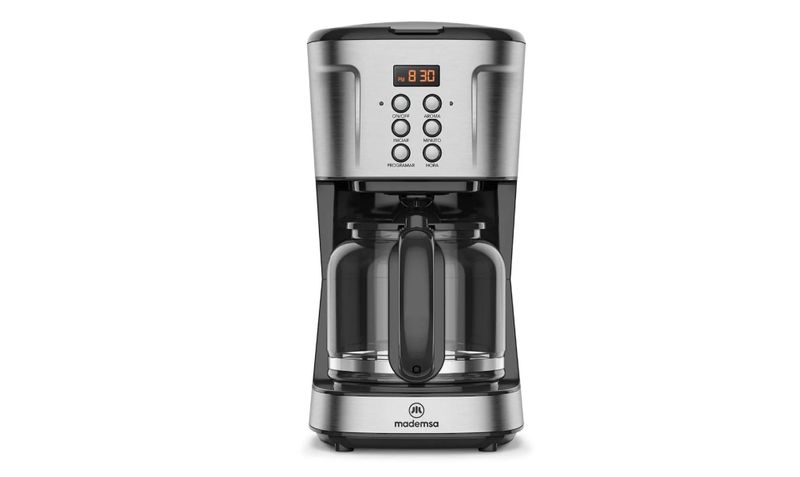 La cafetera eléctrica programable Mademsa MCM30 de 1,5 L está diseñada para preparar café filtrado de forma práctica y automatizada, ideal para familias o reuniones de varias personas. Su panel digital con temporizador de 24 horas permite programar la preparación con un día de anticipación, de modo que el café esté listo justo en el momento deseado. Incorpora tecnología AromaStrenght™, que permite seleccionar la intensidad del café, desde más suave hasta más fuerte según preferencia. La jarra de vidrio de 1,5 L permite preparar hasta 38 tazas de 40 ml, mientras que la función mantener caliente conserva el café a temperatura ideal después de la preparación. Además, incluye filtro permanente extraíble, sistema antigoteo y apagado automático a las 2 horas, aportando seguridad, comodidad y menor consumo de insumos.