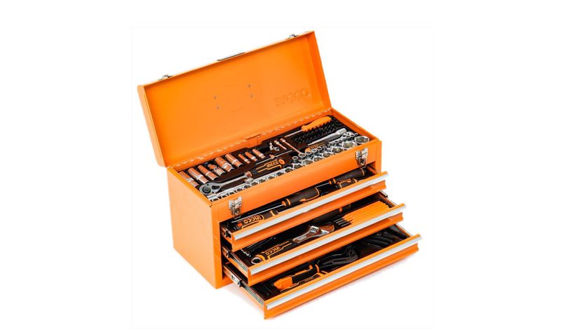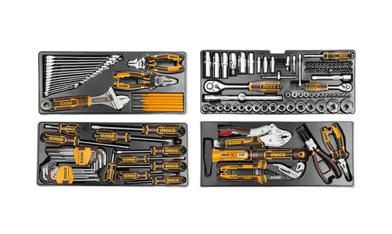 La caja metálica INGCO HTCS221321 contiene un completo set industrial de 132 herramientas manuales esenciales para mecánica, mantenimiento, carpintería y electricidad. Incluye dados, chicharras, extensiones, puntas, llaves hexagonales y torx, destornilladores, alicates, caimán, martillo, llave ajustable, punzones y otros accesorios. Todos los elementos están organizados en bandejas metálicas robustas para fácil transporte, almacenamiento y máxima durabilidad en entorno profesional.