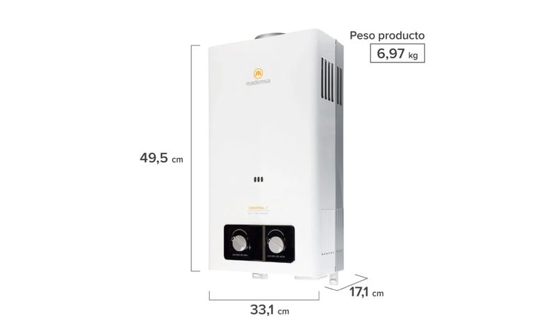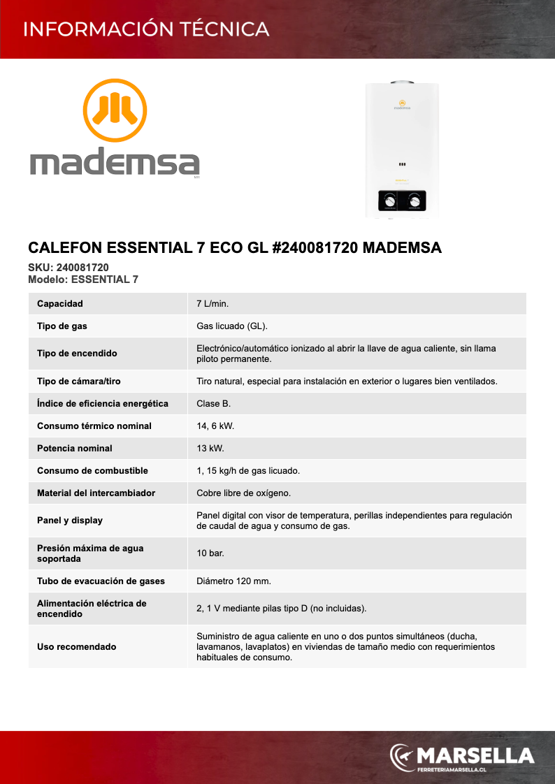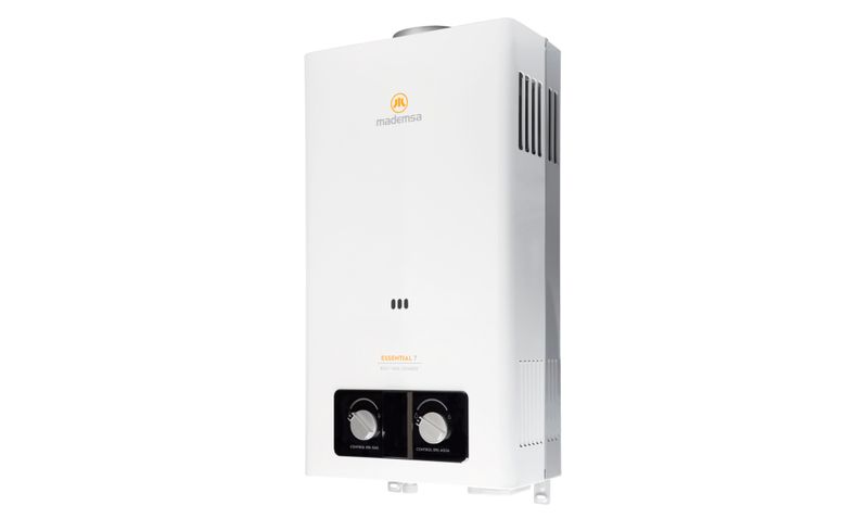 El calefón Mademsa Essential 7 ECO GL de 7 litros por minuto está diseñado para suministrar agua caliente de forma continua en ducha, lavamanos y lavaplatos, siendo una solución adecuada para departamentos y casas de tamaño medio. Funciona con gas licuado y tiro natural, incorpora encendido electrónico/ionizado que se activa al abrir la llave de agua caliente y se apaga al cerrarla, entregando mayor comodidad y ayudando a reducir el consumo de gas. Su intercambiador de calor de cobre libre de oxígeno y la avanzada tecnología de quemadores permiten un calentamiento más eficiente, mientras que la eficiencia energética clase B equilibra buen rendimiento con ahorro energético. Integra múltiples sistemas de seguridad y panel digital con visor de temperatura, y gracias a su formato mural compacto, especial para instalación exterior, se adapta fácilmente a muros ventilados en el hogar.