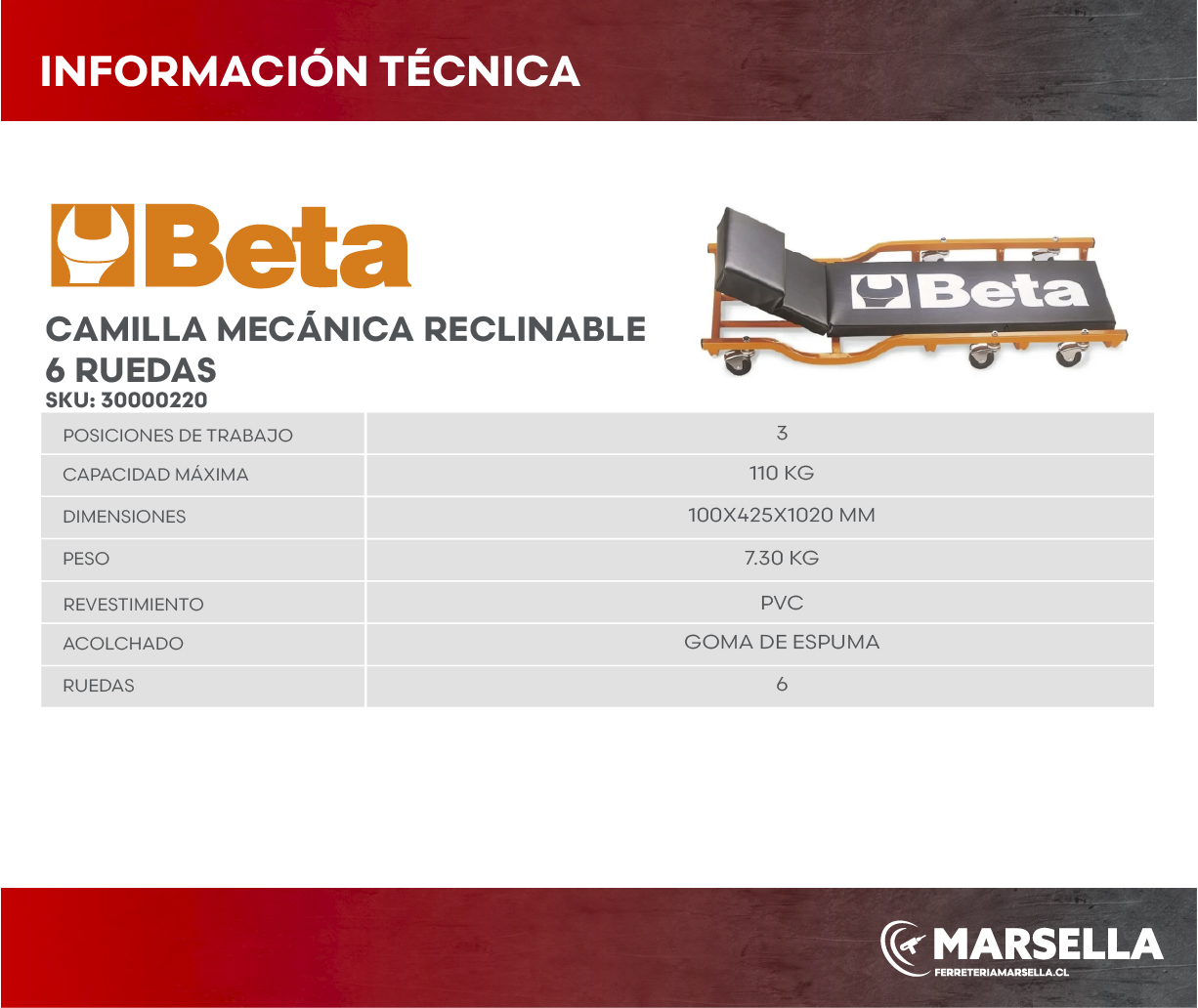La Camilla de Mecánico Reclinable BETA 3000M/LT es una herramienta esencial para talleres y profesionales de la mecánica que buscan comodidad, movilidad y versatilidad al trabajar bajo vehículos. Con seis ruedas resistentes y un diseño reclinable, permite ajustar la posición del operario para acceder a zonas difíciles, proporcionando ergonomía y seguridad durante las operaciones.