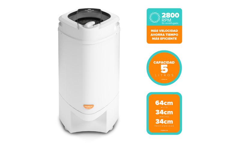 La centrífuga Mademsa Primma 5N de 5 kg es una centrífuga de ropa de carga superior que acelera el secado de las prendas al extraer de forma eficiente el exceso de agua antes del tendido o uso de secadora. Su tambor de acero inoxidable gira a 2800 rpm, logrando una alta velocidad de centrifugado que reduce significativamente la humedad residual y ayuda a cuidar mejor los tejidos. Incorpora boquilla antiderrame para evacuar el agua extraída, freno automático, tapa con bloqueo de seguridad y motor termoprotegido, ofreciendo un uso más seguro y estable. Gracias a su diseño compacto y liviano, con patas de goma antideslizantes y manillas laterales, es fácil de ubicar y mover en espacios reducidos como logias o baños.