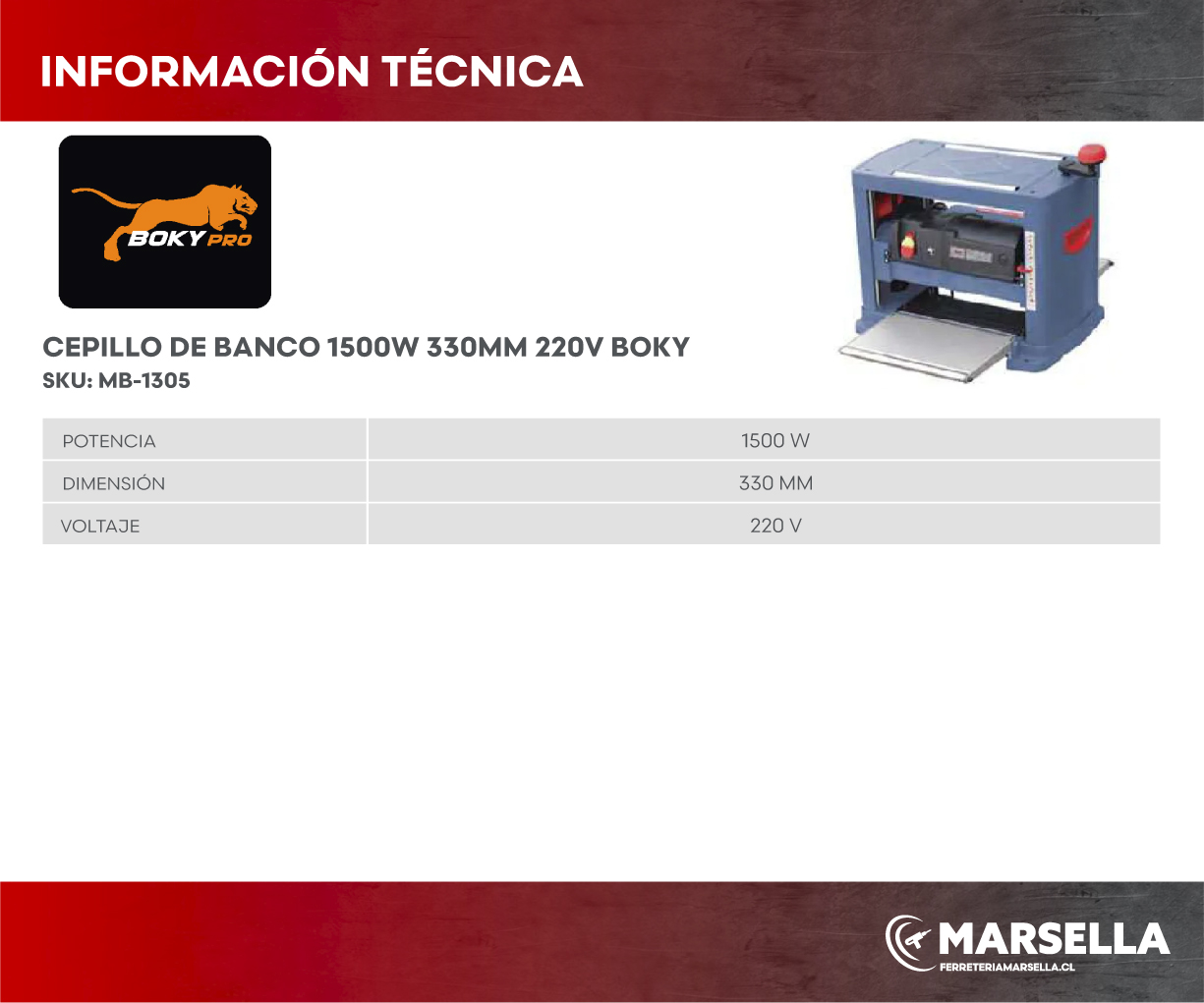 El Cepillo de Banco BOKY 1500W 330mm 220V es una herramienta potente y precisa diseñada para el desbaste y alisado de superficies de madera y otros materiales. Con un ancho de cepillado de 330 mm y motor de alta potencia de 1500W, este cepillo ofrece un rendimiento profesional ideal para talleres de carpintería y bricolaje avanzado.