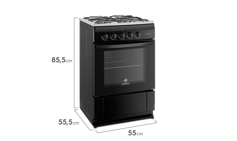 La cocina a gas Mademsa MV 120 T de 4 quemadores es una cocina de piso en color negro con cubierta de acero inoxidable, pensada para funcionar con gas licuado o gas natural y entregar una solución práctica y eficiente para la cocción diaria en el hogar. Cuenta con 4 quemadores (3 semi rápidos y 1 rápido) que permiten adaptar la llama a diferentes tipos de preparaciones, mientras su horno de 65 litros con recubrimiento Fast Clean/LimpiaFácil facilita la limpieza interior. La cubierta de acero inoxidable con parrillas de alambrón esmaltadas ofrece buena estabilidad a ollas y sartenes, y su diseño compacto la hace adecuada para cocinas pequeñas y medianas. Incorpora sistema de seguridad en quemadores y horno, manteniendo un buen nivel de protección durante el uso.