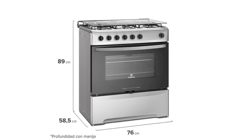 Uso recomendado: Cocinas familiares que necesitan mayor capacidad de quemadores y horno amplio para uso intensivo, manteniendo buena eficiencia y facilidad de limpieza.