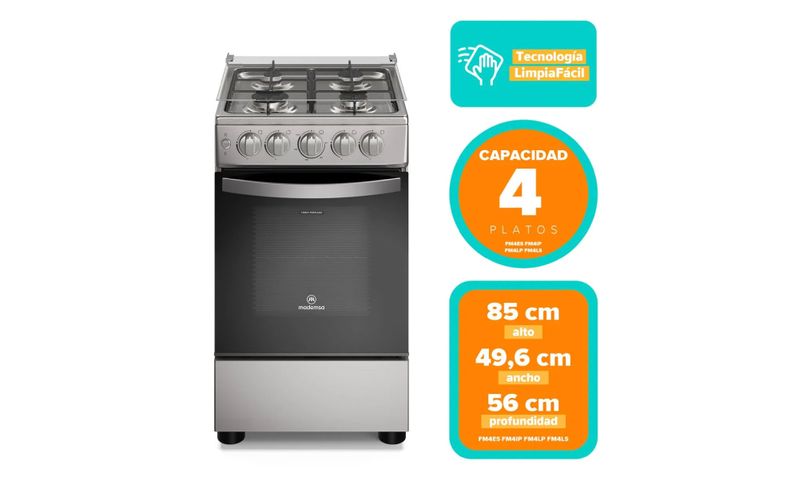La cocina a gas Mademsa FM4ES de 4 quemadores es una cocina de piso en color silver, diseñada para funcionar con gas licuado y ofrecer una solución compacta y eficiente para la cocción diaria en el hogar. Incorpora tecnología LimpiaFácil en el horno con esmalte vitrificado, que evita la adherencia de grasa y restos de comida, facilitando la limpieza después de cada uso. Su cubierta de acero inoxidable con parrillas de alambrón esmaltadas, quemadores sellados y botones extraíbles mejora la higiene y entrega mayor estabilidad a ollas y sartenes. Además, cuenta con tapa de vidrio templado, botón de encendido automático y sensor de bloqueo de gas, ofreciendo más practicidad y seguridad al cocinar.
