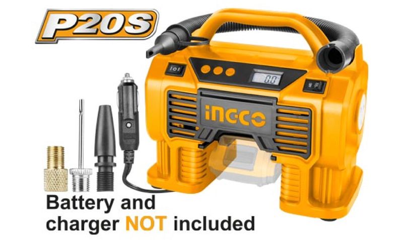 Compresor inflador inalámbrico INGCO CACLI2002, uso industrial/automotriz, alimentado con batería 20V Li-Ion (NO incluida) o cable auto 12V. Presión máxima 160 PSI (11 bar), caudal 45 L/min, pantalla digital con parada automática, luz LED de trabajo integrada. Incluye adaptadores para neumáticos, pelotas, colchones/colchón inflable, tubo de aire y cable encendedor 3m. Compacto y portátil.