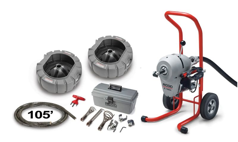 El RIDGID K-1500A (27592) es una maquina seccional electrica creada para limpiar lineas de drenaje y alcantarillado de 2" a 8" (50 a 200 mm) de diametro. Es ideal para aplicaciones comerciales e industriales, permitiendo a una sola persona abordar bloqueos dificiles tanto en interiores como en exteriores. Su formato compacto y ruedas integradas facilitan el transporte y la configuracion rapida en el lugar de trabajo