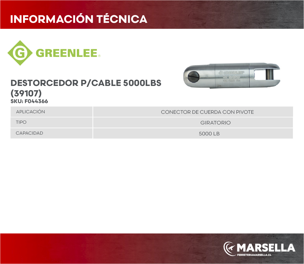 Destorcedor para Cable 5000 LBS GREENLEE 39107 es una herramienta diseada para evitar la torsin y el dao en cables durante operaciones de tendido y traccin. Su construccin robusta en acero de alta resistencia proporciona una gran durabilidad y seguridad en trabajos elctricos e industriales exigentes.