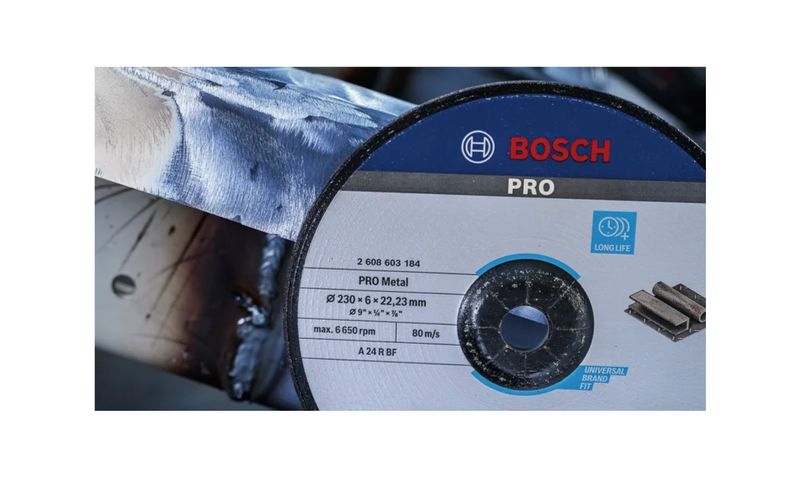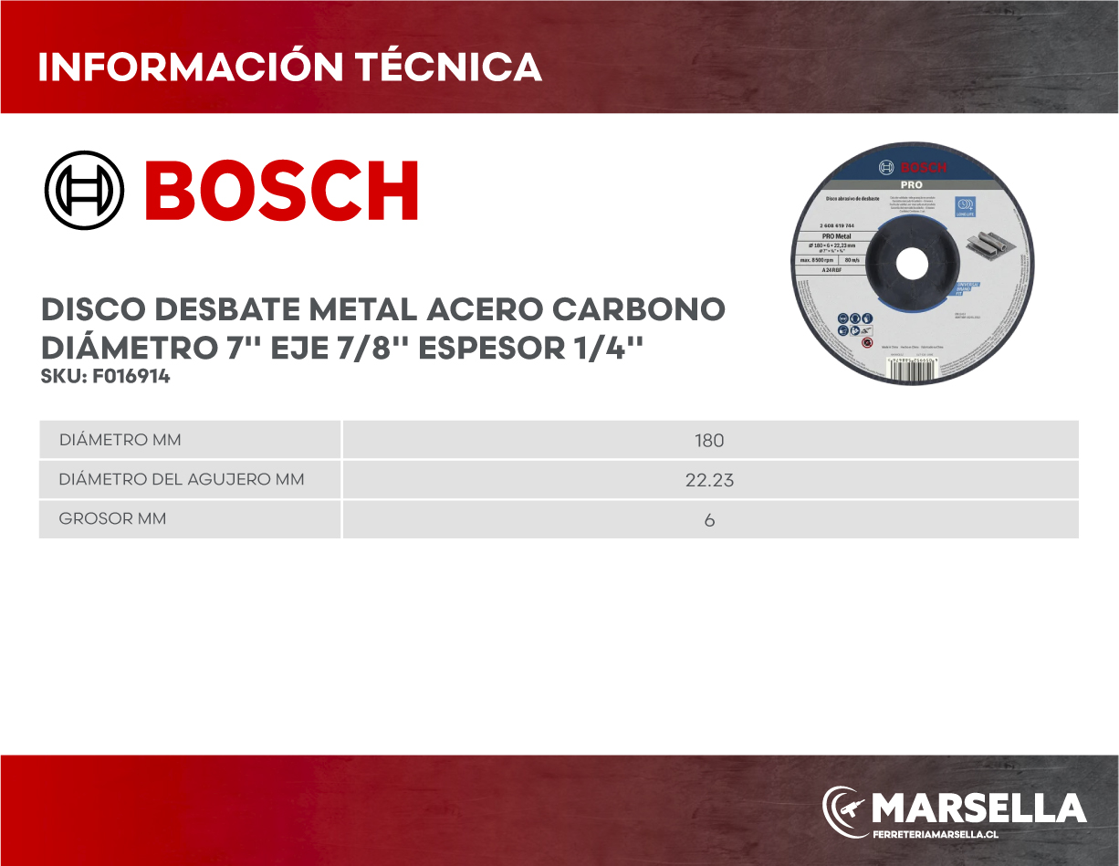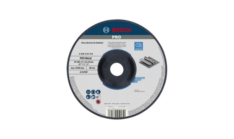 El disco de desbaste Bosch para metal, de 7″ (≈ 180 mm) de diámetro, con eje estándar de 7/8″ (22,23 mm) y espesor de ¼″ (≈ 6,35 mm) está diseñado para trabajos intensivos en metales ferrosos y no ferrosos, como acero al carbono, hierro fundido o aleaciones. Gracias a su construcción reforzada con fibra de vidrio de múltiples capas y mezcla abrasiva de alto rendimiento, permite eliminar cordones de soldadura, rebajar piezas metálicas, preparar superficies para unión o pintura, todo con alta estabilidad y durabilidad. Ideal para talleres y faenas industriales que requieren rendimiento profesional y seguridad.