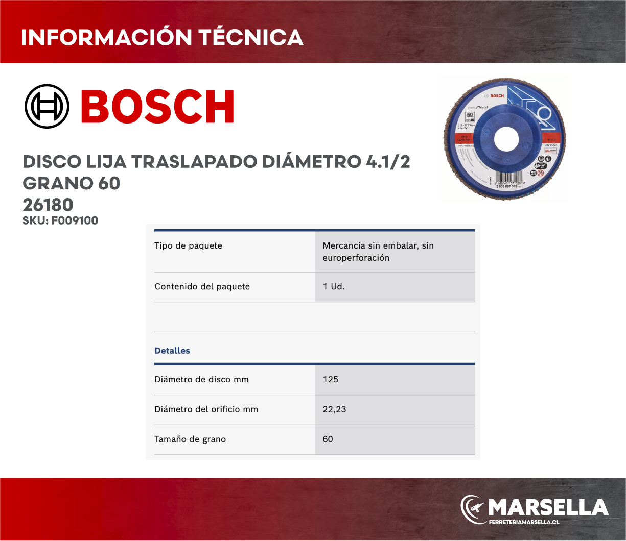 El Disco de Lija Traslapado Bosch 4 ½″ (115 mm) grano 60 es una herramienta de rendimiento profesional diseñada para desbaste y preparación de superficies metálicas. Fabricado con una combinación de alúmina de circonio y óxido de aluminio en soporte de fibra de vidrio, ofrece una excelente tasa de remoción de material con acabado intermedio. Ideal para acero, acero inoxidable, hierro fundido y metales no ferrosos, este disco asegura eficacia en amoladoras angulares estándar gracias a su diámetro de 115 mm y su encastre de 22,23 mm.