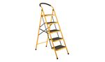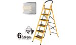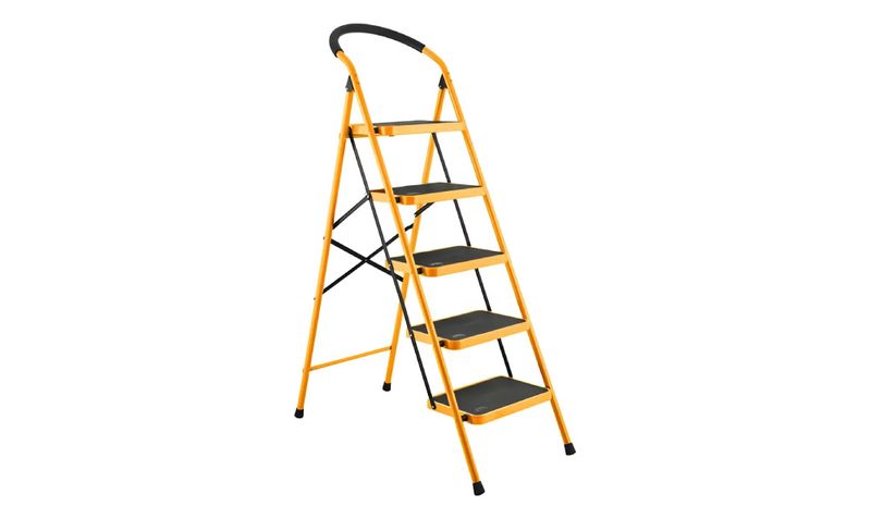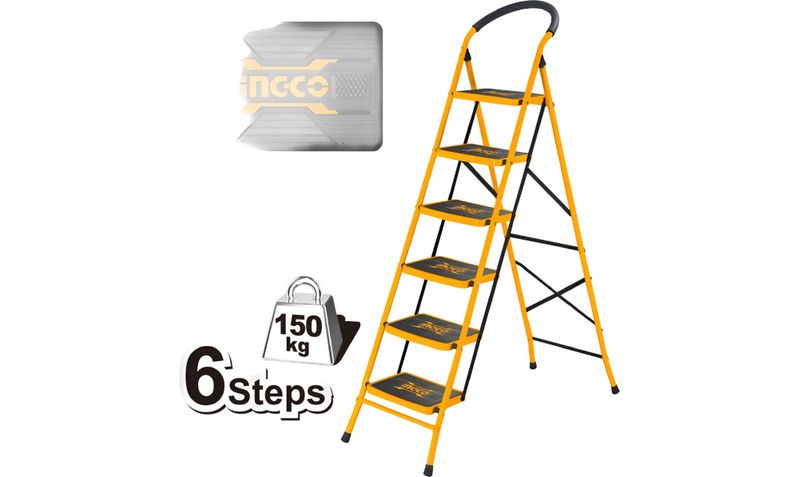 Escalera de tijera y trabajo INGCO HLAD09061, fabricada en acero tubular de alta resistencia, 6 peldaños, capacidad máxima de carga 150 kg. Ideal para tareas de pintura, mantenimiento, instalaciones y hogar. Diseño plegable para fácil almacenamiento, con barandal estabilizador y pies antideslizantes. Cada peldaño mide 38 x 26 cm para mayor seguridad y comodidad.