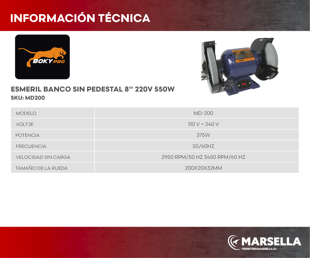 El Esmeril de Banco BOKY de 8 pulgadas sin pedestal es una herramienta versátil y potente diseñada para el afilado, desbaste y pulido de piezas metálicas y herramientas. Con un motor de 550W y un disco de esmeril de 8 pulgadas (200 mm), ofrece un rendimiento eficiente para trabajos en talleres, mantenimiento y fabricación.