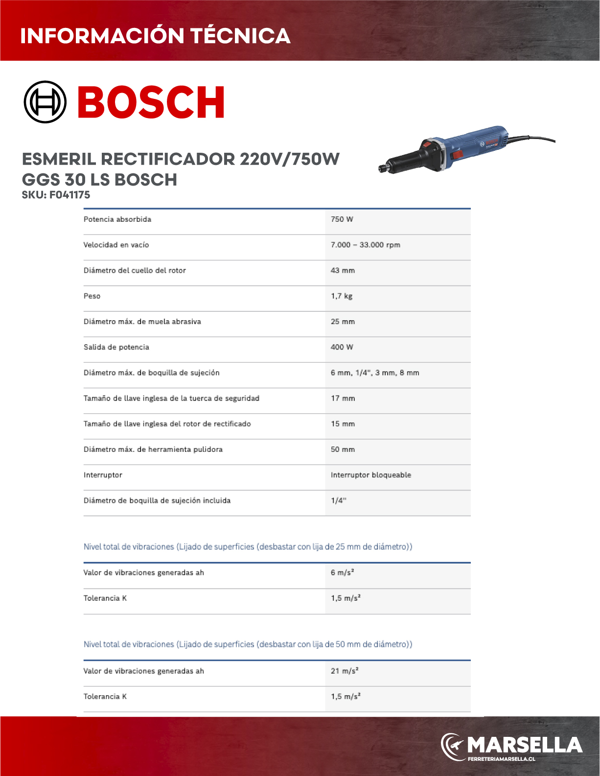 El Bosch GGS 30 LS es un esmeril rectificador o rectificadora recta diseñada para tareas industriales y de taller que requieren precisión y acabados suaves en metal, piedra u otros materiales. Con una potencia de 750 W y una velocidad de hasta 33 000 rpm, esta herramienta ofrece rendimiento elevado en espacios restringidos gracias a su husillo largo y delgado. Está equipada con funciones de seguridad avanzadas como arrancado suave (