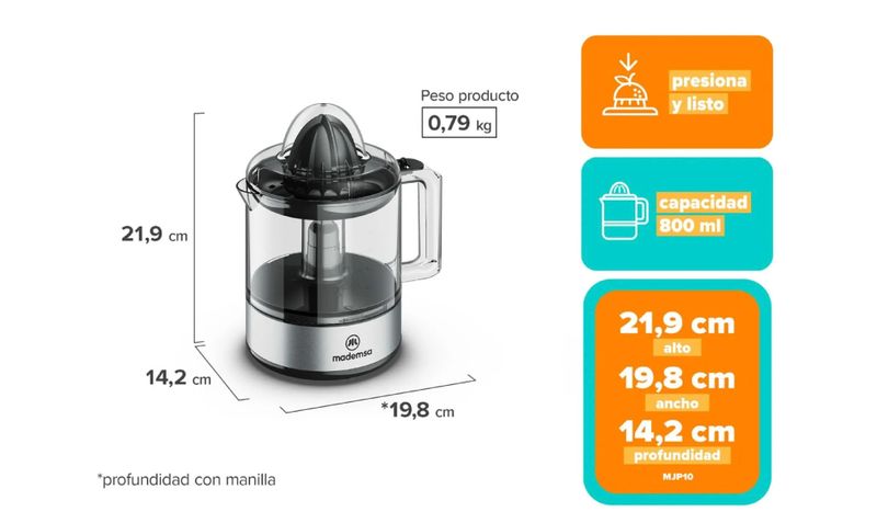 Uso recomendado: Preparación de jugos de naranja, limón y otros cítricos para consumo familiar diario.