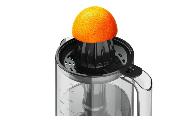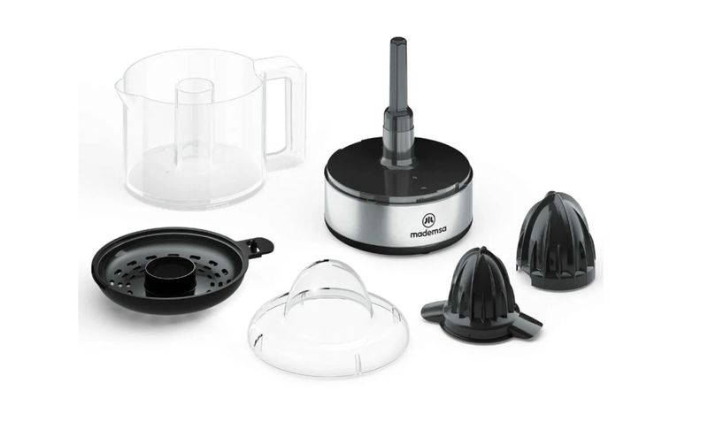 El exprimidor de cítricos Mademsa MJP10 de 0,8 L está diseñado para preparar jugos frescos de naranja, limón o pomelo de forma rápida y cómoda en el hogar. Su funcionamiento automático se activa al presionar la fruta sobre el cono, haciendo que el motor gire y extraiga el jugo sin esfuerzo. La rotación alternada (giro a derecha e izquierda) permite aprovechar mejor la fruta, extrayendo la máxima cantidad de jugo. Incluye 2 conos intercambiables para diferentes tamaños de cítricos y un filtro ajustable que permite elegir jugo con más o menos pulpa según preferencia. Su diseño en color gris/negro con detalles en acero inoxidable cepillado, accesorios desmontables aptos para lavavajillas y material libre de BPA aporta practicidad, durabilidad y seguridad alimentaria.