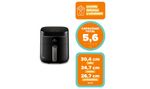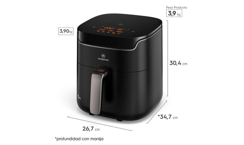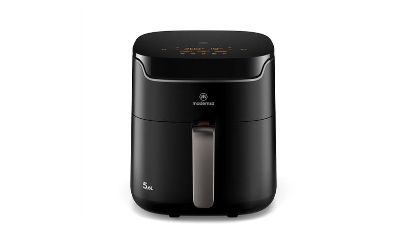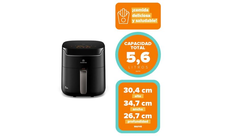 La freidora de aire digital Mademsa MAF45 (SKU 955117889) es una freidora sin aceite con panel digital, capacidad de 5,6 litros, potencia de 1400 W y cuerpo negro, diseñada para preparar porciones medianas/familiares con menor uso de aceite mediante circulación de aire caliente. Permite freír, asar, hornear y recalentar alimentos con control electrónico de tiempo y temperatura a través de su panel frontal, recubrimiento antiadherente para fácil limpieza y diseño compacto que se adapta bien a cocinas con espacio limitado.