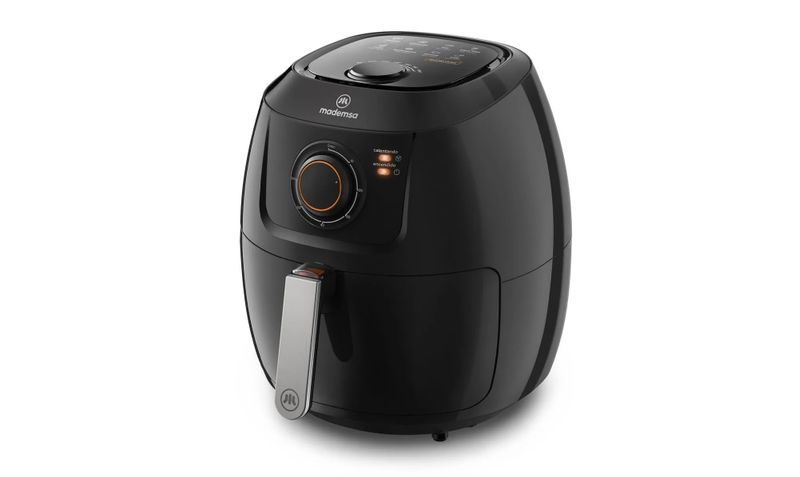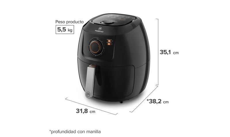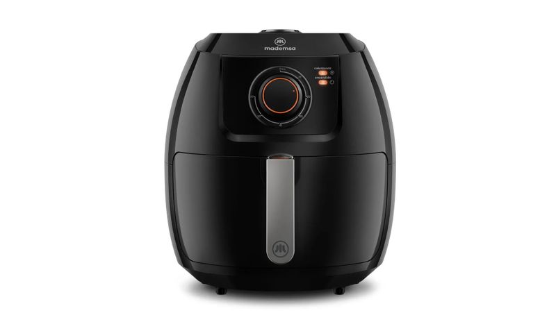 La freidora de aire Mademsa MAF50 (SKU 955117840) es una freidora sin aceite tipo canasta, de color negro, con cubeta de 6,5 litros y canasta interna útil de 5 litros, potencia de 1700 W y panel analógico, diseñada para preparar porciones familiares con hasta un 90% menos de grasa que la fritura tradicional. Incorpora cesto antiadherente de doble capa compatible con lavavajillas, temporizador de hasta 60 minutos con apagado automático, selector de temperatura de 80 a 200 °C, 8 recetas pre‑sugeridas (carne, empanadas, hamburguesa, pan, papas fritas, pescado, pollo, vegetales) e indicador luminoso de funcionamiento.
