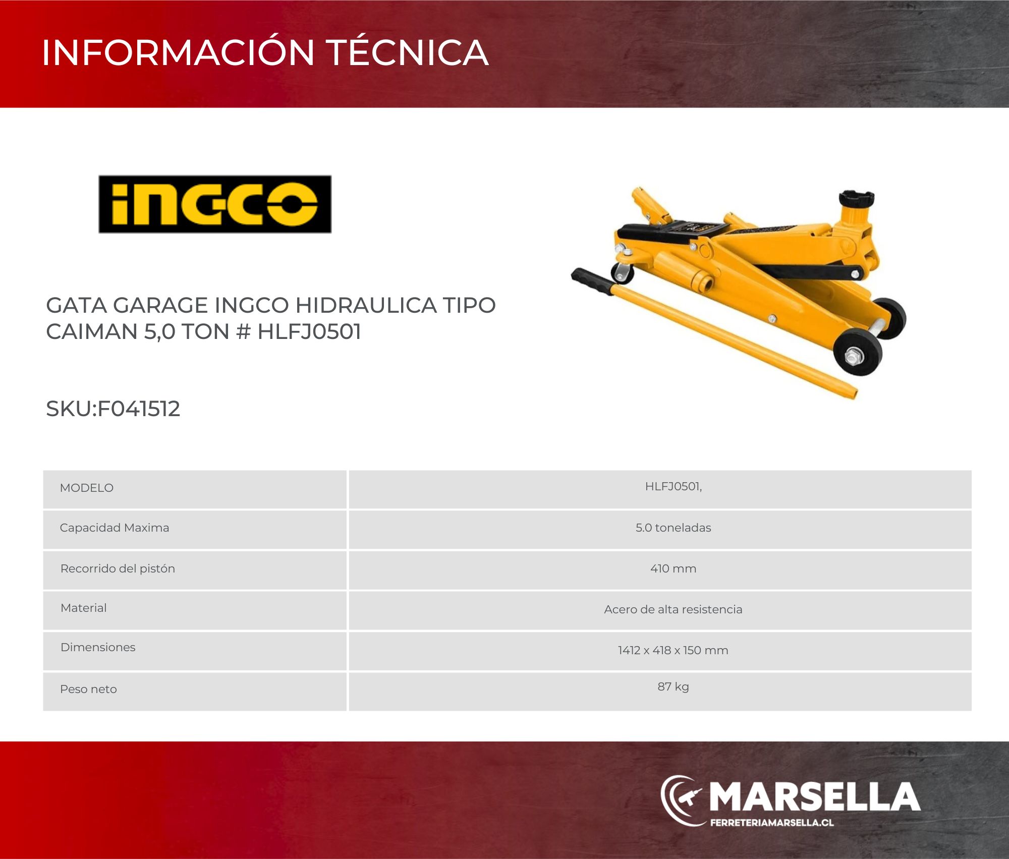 La gata hidráulica tipo caimán INGCO HLFJ0501 es una herramienta robusta y profesional diseñada para elevar vehículos, camiones y maquinaria hasta 5 toneladas. Su estructura de acero de alta resistencia, base ancha y ruedas de acero garantizan estabilidad y fácil movilidad en talleres automotrices, garajes y servicio industrial. Con brazo de largo alcance (Jack largo), permite acceso cómodo incluso en vehículos con chasis bajo. El rango de elevación va desde 150 mm (altura mínima) hasta 560 mm (altura máxima), ideal para trabajos de mantenimiento, cambio de neumáticos y reparación bajo vehículo. El sistema hidráulico de doble pistón facilita una elevación rápida, controlada y segura, reduciendo la fatiga y aumentando la eficiencia operativa. Incluye válvula de sobrecarga para máxima seguridad.