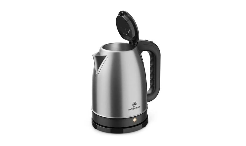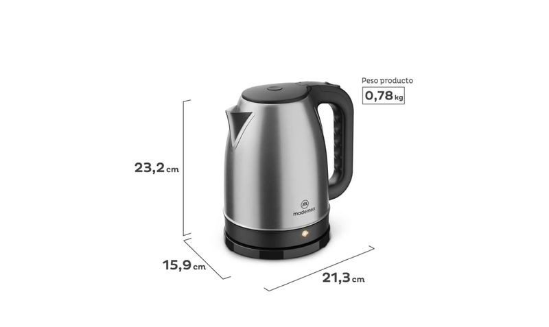 El hervidor eléctrico Mademsa MEK10 (1,8 L, código 955117810) es un hervidor tradicional de acero inoxidable con base 360°, apagado automático y capacidad de 1,8 litros, pensado para uso doméstico diario. Su diseño compacto en color gris Granite Gray con tapa de apertura rápida facilita el llenado y vertido, mientras que la luz indicadora de encendido y la base desmontable permiten un manejo seguro y práctico en la cocina. Incorpora protección que impide el funcionamiento sin agua y se apaga automáticamente al alcanzar la temperatura de ebullición, aportando seguridad y eficiencia en el consumo. Su cuerpo de acero inoxidable ofrece buena durabilidad y un acabado moderno que se integra fácilmente en diferentes estilos de cocina.