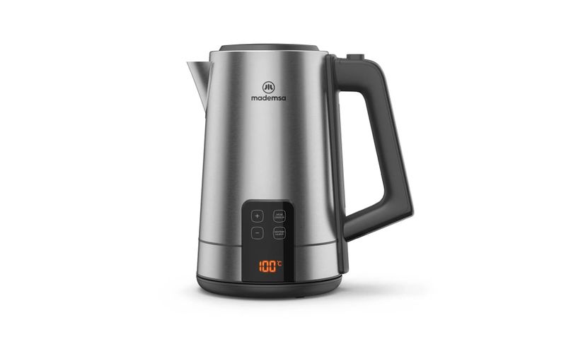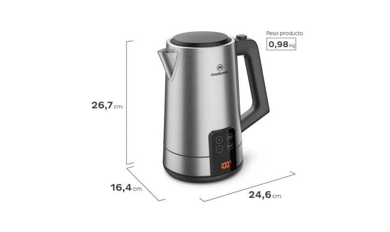 El hervidor eléctrico Mademsa MEK50 (2 L, código 955117877) es un hervidor de acero inoxidable con control de temperatura y panel digital, diseñado para calentar agua con precisión entre 40 °C y 100 °C para té, café, mamaderas e infusiones especiales. Su capacidad de 2 litros y potencia de 2000 W permiten un calentamiento rápido para varias tazas, mientras que la función mantener caliente conserva la temperatura seleccionada durante varios minutos sin necesidad de volver a hervir. Incorpora apagado automático inteligente, filtro antisarro extraíble, base giratoria 360° y visor de nivel de agua, todo en un diseño moderno inox que se integra con encimeras contemporáneas.