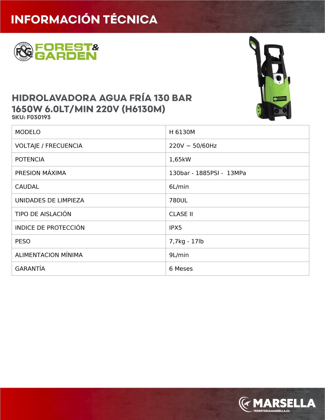 Hidrolavadora Elctrica*Auto Stop, detiene el equipo cuando se suelta el gatillo de la lanza*Fusible trmico incorporado, protege el equipo de sobrecarga de trabajo y baja tensin*Diseo ultra moderno y compacto*Temperatura mxima de agua 60C*Manija de transporte con porta lanza incluido