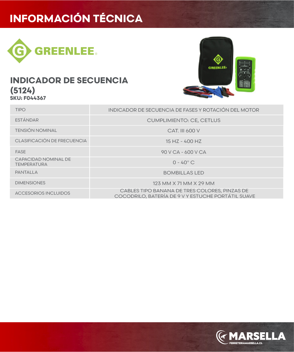 El Indicador de Secuencia 5124 GREENLEE es un dispositivo compacto y preciso que permite verificar la secuencia de fases en sistemas trifsicos, ideal para instalaciones elctricas industriales. Conectando sus cables de prueba a las tres fases, el equipo muestra de forma visual si la conexin es correcta, ayudando a prevenir daos en motores u otros equipos sensibles. Es una herramienta esencial para electricistas que buscan seguridad y confiabilidad en sus diagnsticos.