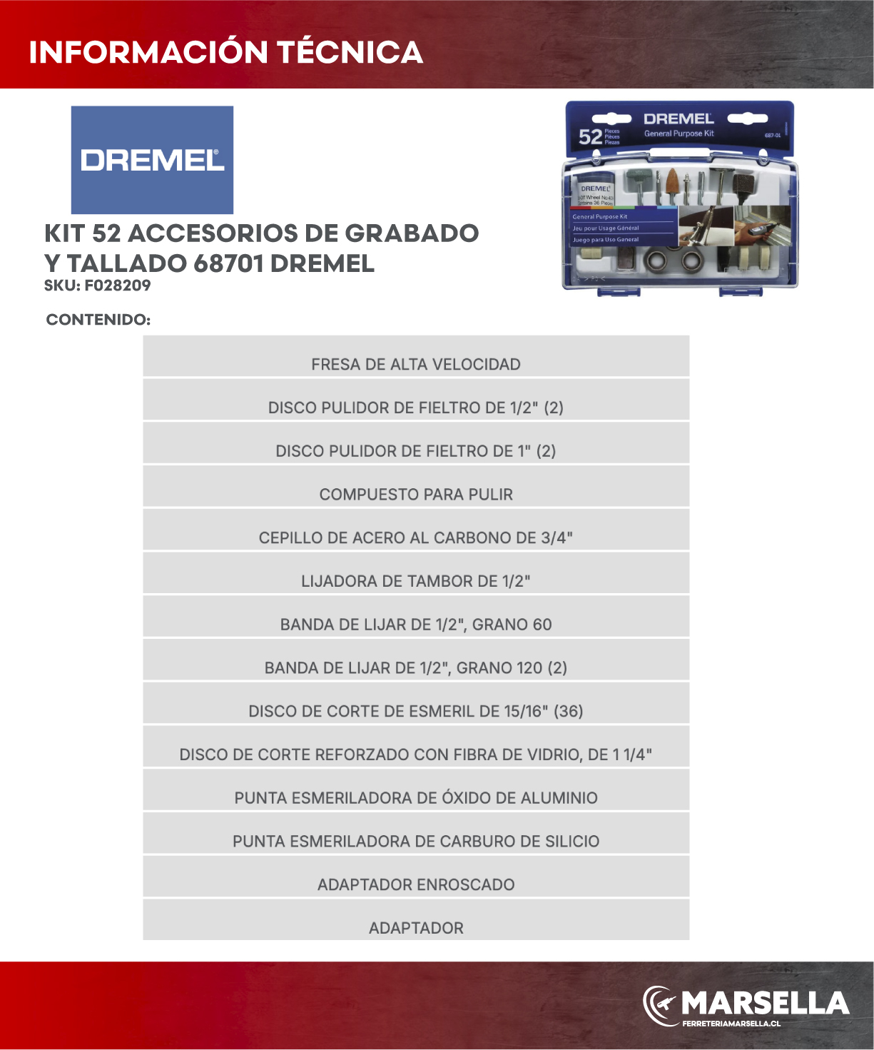 El Kit Multiusos de 52 Piezas de Dremel amplía la variedad de acabados que puedes lograr con tu herramienta multipropósito Dremel. Son instrumentos para lograr las terminaciones precisas que no se pueden completar con las maquinarias convencionales. Está conformado de una caja con secciones individuales para mayor organización de los accesorios. Incluye puntas para grabar, amolar, pulir, cortar y lijar.El Kit Multiusos de 52 piezas de Dremel tiene todo lo necesario para proyectos artísticos, carpintería y reparaciones domésticas. Este conjunto te permite lijar, tallar, grabar, fresar, cortar, pulir y muchas más funciones. Es apropiado para trabajar piezas de madera, fibra de vidrio, plástico y metales blandos.