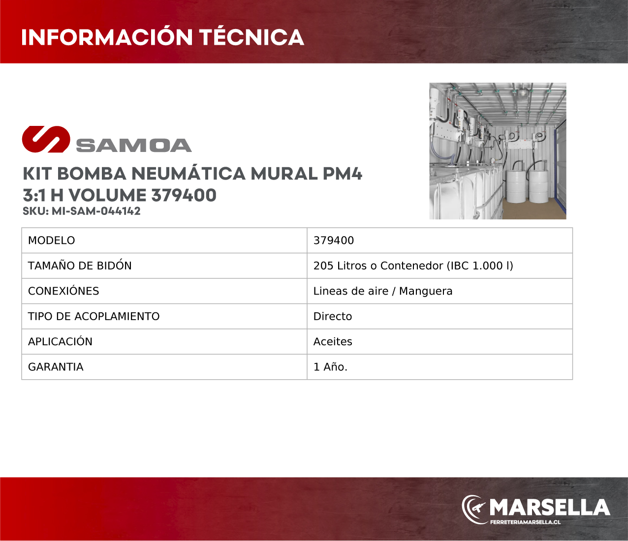 Kit de bomba neumatica equipada para montaje mural sobre pared. El conjunto de succion desplazado facilita el cambio de envase. Para utilizar con bidones originales de aceite de 205 l o contenedores normalizados (IBC) de 1.000 l de capacidad.
