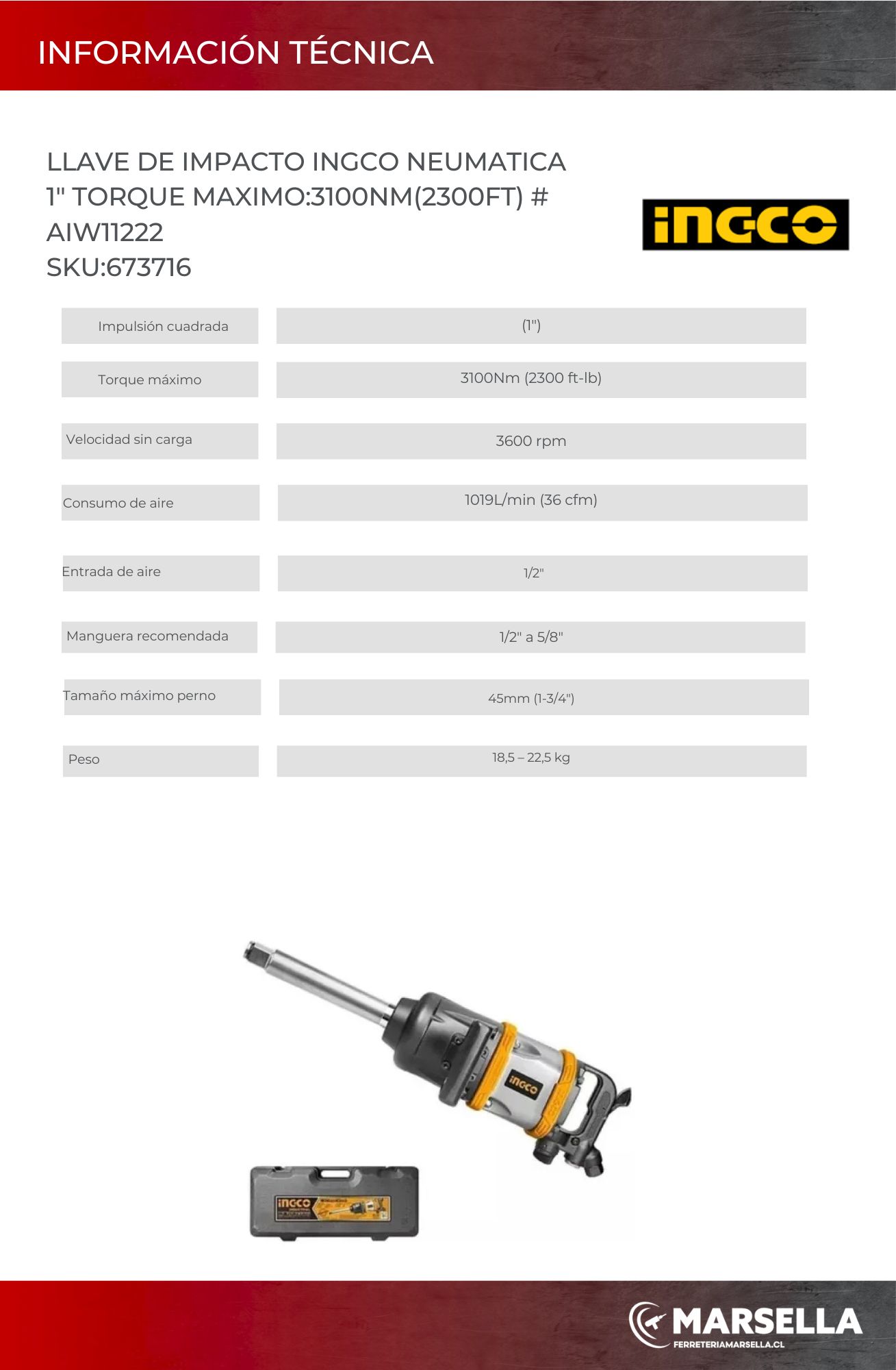La llave de impacto neumática INGCO AIW11222 de 1" es una herramienta industrial para trabajos exigentes en talleres, flotas, maquinaria pesada, minería y montaje estructural. Con torque máximo de 3100Nm (2300 ft-lb), libera, ajusta y aprieta pernos de gran diámetro con mínimo esfuerzo. Su yunque extendido de 8" (200mm), impulsión cuadrada de 25,4mm (1"), motor de alta durabilidad y sistema de doble martillo aseguran un rendimiento fuerte y continuo. El cuerpo robusto, mango lateral y conector universal garantizan seguridad y control en uso profesional intensivo.