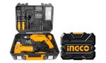 Maleta de herramientas multifunción INGCO HKTHP11081, contiene 108 piezas y dos taladros (uno percutor 680W 13mm y uno inalámbrico 12V Li-Ion con batería y cargador). Ideal para uso hogar, taller y mantenimiento general. Incluye brocas, puntas, destornilladores, llaves, alicates, huincha, tornillos y accesorios en estuche rígido portátil.