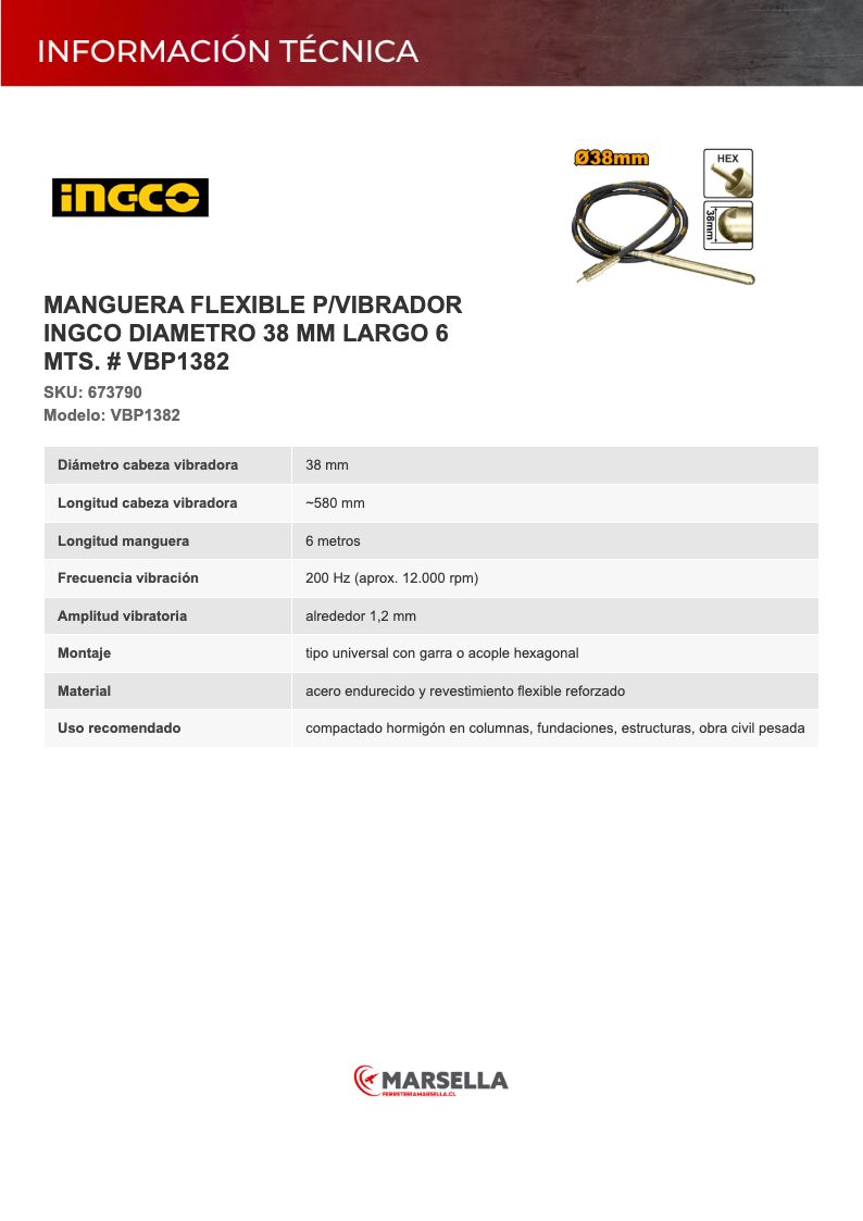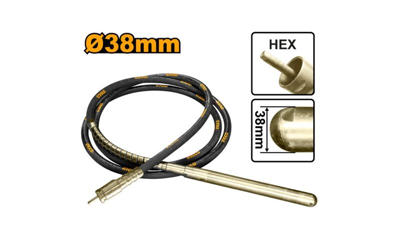 Manguera flexible (sonda/chicote) para vibrador de concreto INGCO modelo VBP1382, diseñada para uso profesional en construcción y obra civil. Compatible con motovibradores INGCO y equipos universales similares para compactación y consolidación de hormigón. Diámetro de cabeza vibradora 38 mm, longitud total 6 metros, fabricada con materiales resistentes y flexibles para trabajo prolongado en obra.