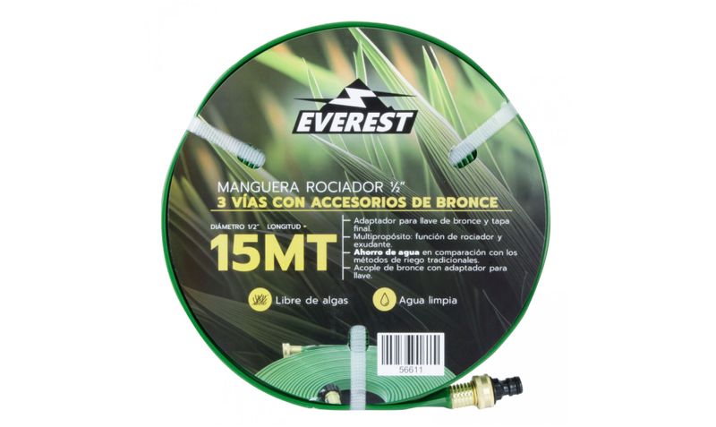 La Manguera Rociador 1/2" 3 Vías de 15 metros con accesorios de bronce EVEREST MI-EVE-056611 es la solución ideal para riego eficiente y versátil en jardines, huertos y maceteros. Gracias a su diseño de 3 vías, permite distribuir el agua de manera uniforme en diferentes direcciones, optimizando el riego y ahorrando agua.