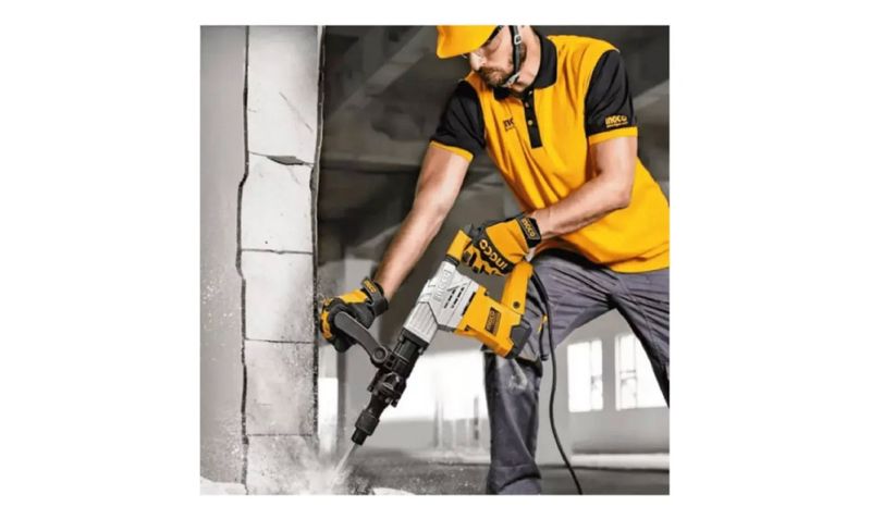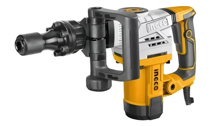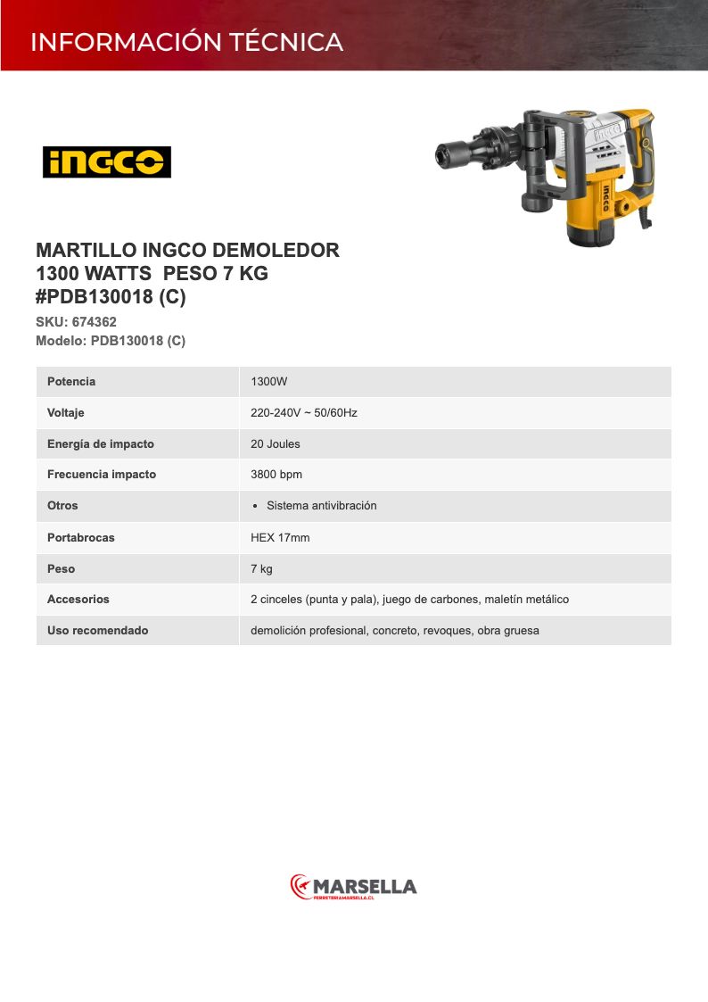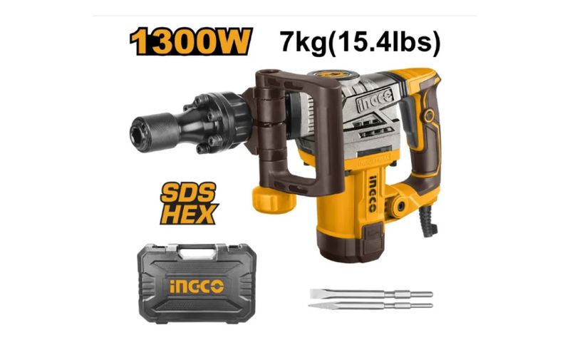 Martillo demoledor eléctrico INGCO PDB130018, uso industrial, ideal para demolición en concreto, ladrillo y obra gruesa. Motor 1300W, energía de impacto 20J, frecuencia 3800 golpes/min, sistema antivibración, portabrocas HEX 17mm. Peso total 7 kg. Incluye 2 cinceles (punta y pala), juego de carbones y maletín metálico profesional.