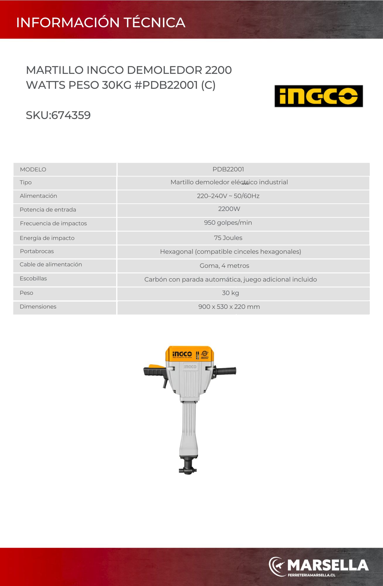 El martillo demoledor eléctrico INGCO PDB22001 es una herramienta de construcción industrial diseñada para trabajos de demolición pesada en hormigón, ladrillo y piedra. Cuenta con motor de 2200W, energía de impacto de 75 Joules y sistema antivibración para operación segura y cómoda. Su sistema de doble aislamiento, portabrocas hexagonal y escobillas de carbón con parada automática aseguran durabilidad, rendimiento profesional y menor mantenimiento. Incluye 2 cinceles, cable de goma de 4 metros, carcasa reforzada y mango ergonómico para control y estabilidad.