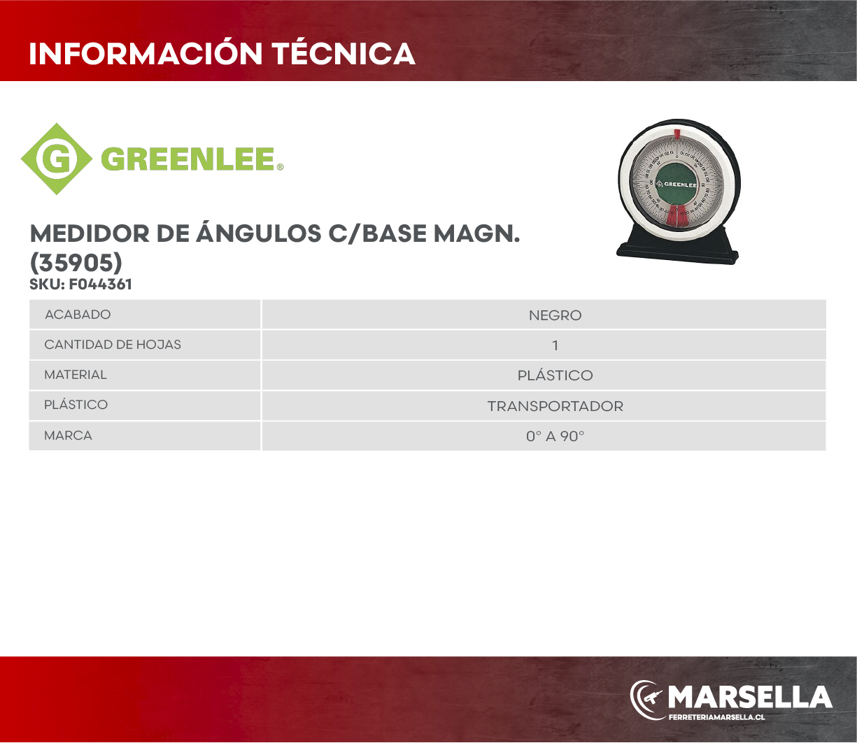 El Medidor de ngulos Greenlee 35905 con base magntica es una herramienta de precisin indispensable para profesionales de la instalacin elctrica, plomera y estructuras metlicas. Su diseo compacto y resistente, junto con su base magntica, permite una medicin precisa de inclinaciones y ngulos sobre superficies metlicas.