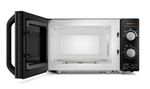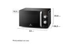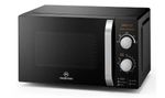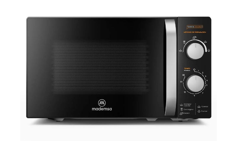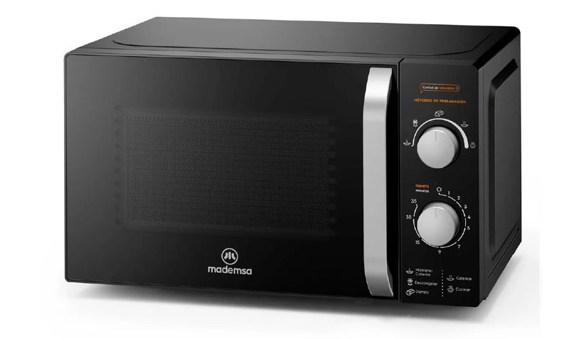 El microondas manual Mademsa MM20FBM de 20 L está diseñado para un uso diario sencillo, con panel analógico de 2 perillas que permite calentar, descongelar, derretir y cocinar sin menús digitales. Su diseño compacto en color negro comparte las mismas dimensiones externas que el modelo digital MM20FBH, facilitando su ubicación en muebles o nichos predefinidos. Incluye función de descongelado por tiempo, temporizador de hasta 35 minutos y plato giratorio de vidrio que ayuda a una cocción más uniforme.