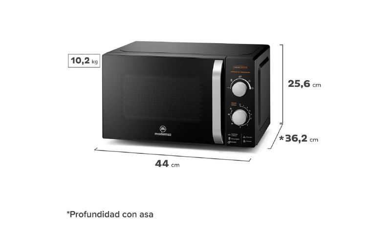 Tecnología principal: Panel analógico con 2 perillas (modo y tiempo) y funciones preconfiguradas para derretir, calentar, recalentar, mantener caliente, cocinar y descongelar.