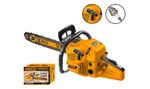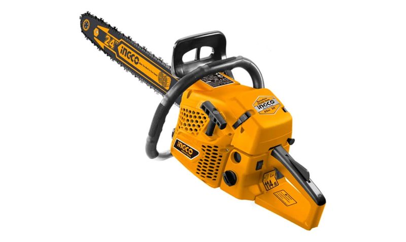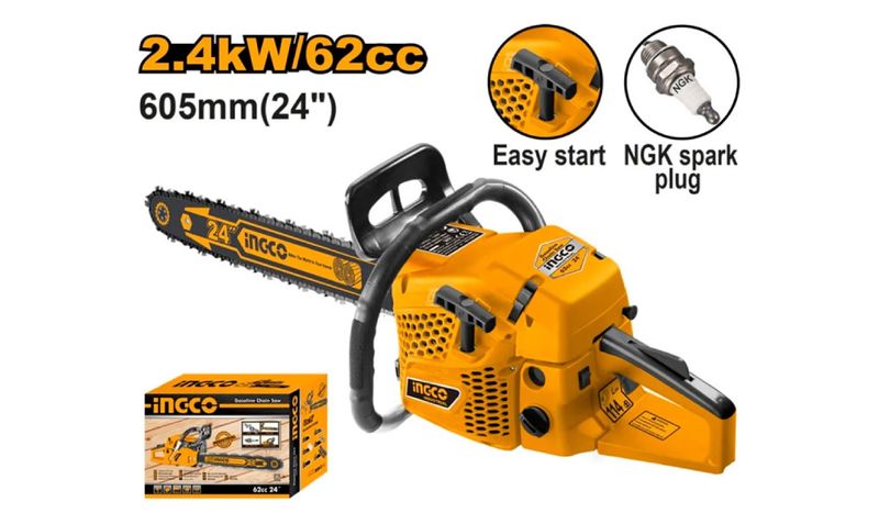 La motosierra INGCO GCS5602411 es una herramienta profesional a gasolina de alto rendimiento, recomendada para tala, poda y cortes de troncos en faenas forestales, agrícolas y de obra civil. Equipada con motor de 2 tiempos, 62cc y potencia 2,4kW, alcanza velocidades de ralentí de 3100 rpm y corte efectivo hasta 605mm (24”). Dispone de depósito de combustible de 550ml, depósito de aceite 260ml, sistema antivibración, cadena y barra de sierra de 24” (marca AGSB52401), tensor lateral y carcasa robusta para trabajo prolongado. Compatible con cadena Oregon.