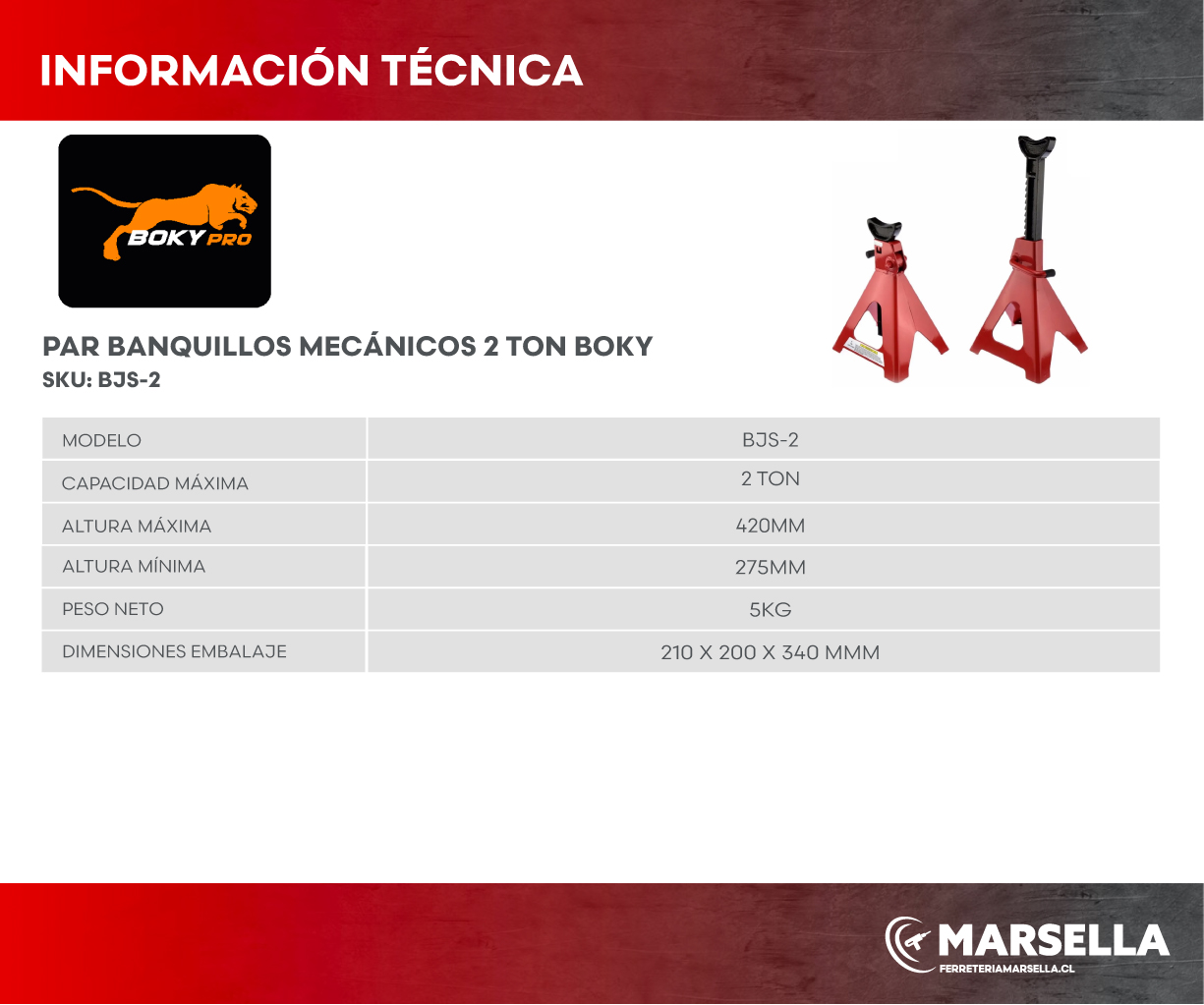El Par de Banquillos Mecánicos BOKY 2 Ton es un equipo fundamental para la elevación y soporte seguro de vehículos durante trabajos de mantenimiento, reparación y montaje. Fabricados con materiales resistentes y diseño robusto, estos banquillos ofrecen estabilidad y seguridad al sostener cargas de hasta 2 toneladas.