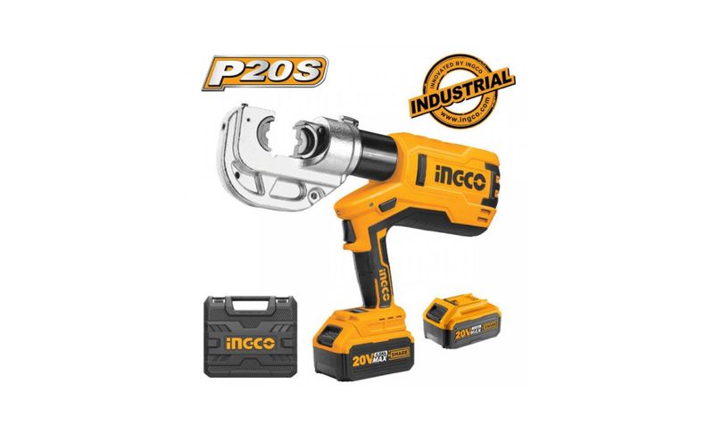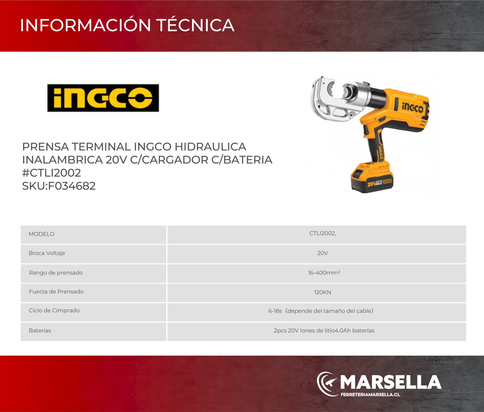 Especificaciones técnicas Marca: INGCO Modelo: CTLI2002 Alimentación: Batería litio 20V P20S (2x 4.0Ah incluidas) Fuerza máxima de prensado: 120 kN (12 toneladas) Rango de crimpado: 16–400 mm² Ciclo de engarzado: 6–18 s (según diámetro del cable) Matriz de crimpado: 12 matrices incluidas Pantalla: LED recuento de usos Alarma: Visual/auditiva por error Accesorios incluidos: