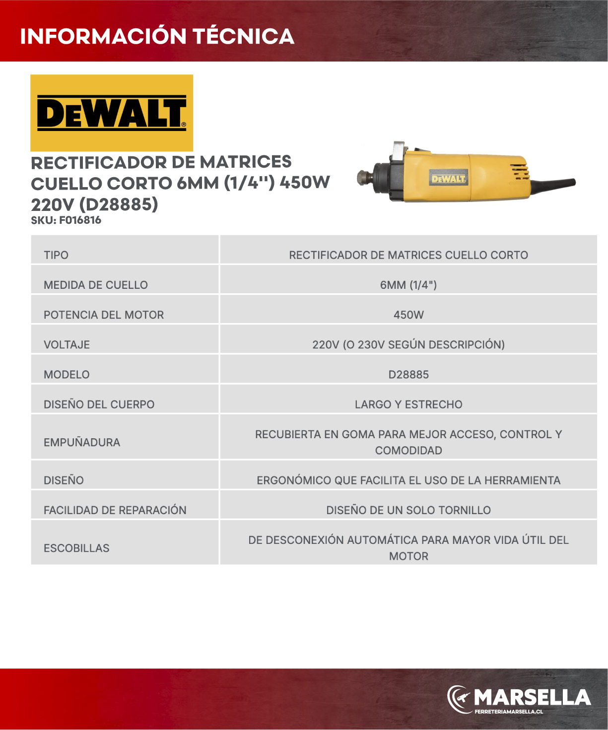 El rectificador de matrices de la marca DEWALT modelo D28885 con mandril de 6 mm y potencia aproximada de 450 W ofrece una solución compacta y potente para trabajos de rectificado, pulido, desbaste o acabado en espacios reducidos. Su diseño de cuello corto permite acceder a zonas de difícil acceso, brindando mayor maniobrabilidad. Está pensado para profesionales que requieren precisión, control y durabilidad en herramientas eléctricas de uso intensivo.
