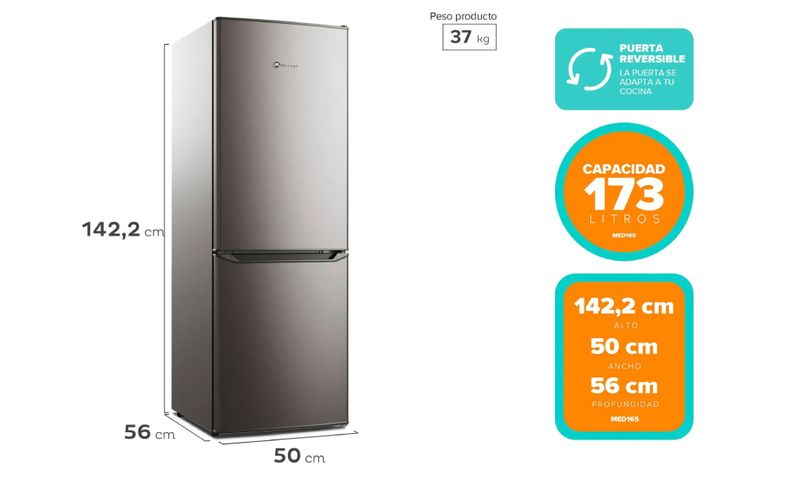 El refrigerador Mademsa MED165 de 166 litros es un bottom freezer de frío directo diseñado para cocinas pequeñas o espacios reducidos, gracias a su ancho compacto de 50 cm. Su configuración con refrigerador en la parte superior y congelador inferior mejora la ergonomía, permitiendo un acceso más cómodo a los alimentos de uso diario. Con eficiencia energética A+ y consumo de solo 16,29 kWh/mes, ofrece un buen equilibrio entre desempeño y ahorro de energía. Incluye puerta reversible para adaptarse al diseño de la cocina, bandejas de vidrio templado y luz LED interior que mejora la visibilidad de los productos almacenados. Su sistema de frío directo mantiene temperaturas estables con bajo nivel de ruido, siendo una solución práctica para hogares que buscan un equipo funcional y compacto.