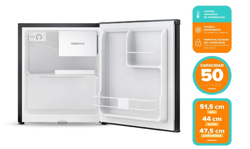 Características clave: Cerradura con llave, control de temperatura manual, una bandeja metálica y puerta con espacio para botellas.