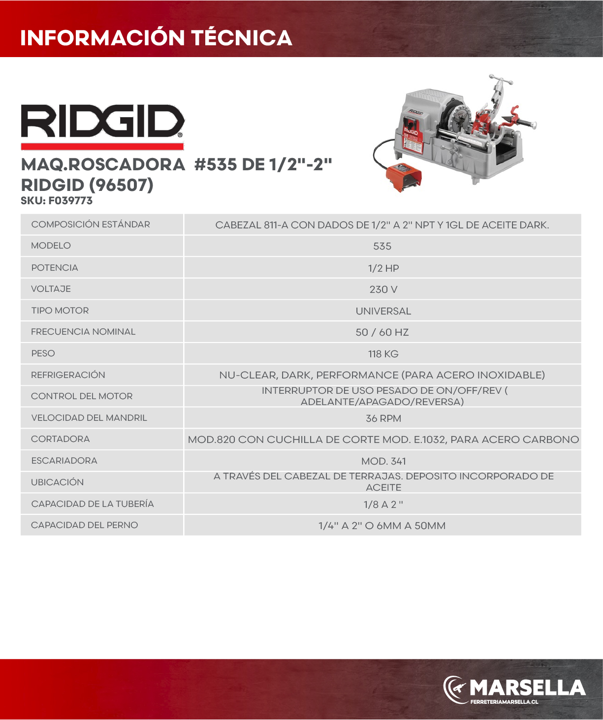 La Mquina Roscadora RIDGID 535 (modelo 96507) est diseada para ofrecer un rendimiento confiable y continuo en la rosca de tuberas de 1/2 a 2 pulgadas. Esta mquina robusta y precisa es ideal para aplicaciones industriales y comerciales, garantizando cortes limpios y uniformes con mnima intervencin del operador. Incluye motor de alta potencia, sistema de lubricacin automtico y soporte de roscado verstil.