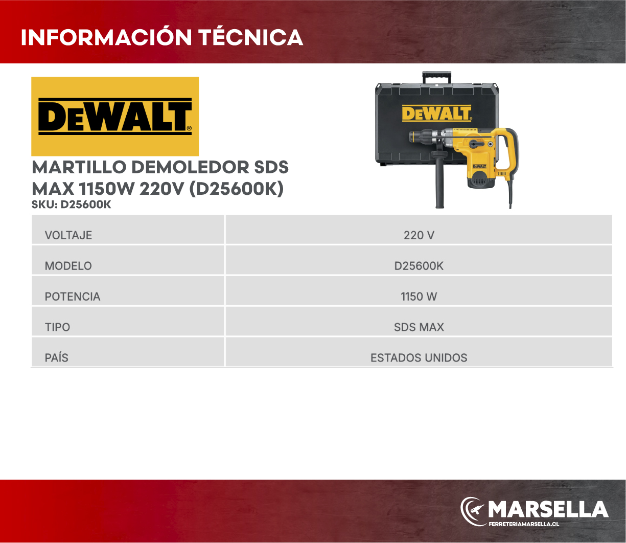 El Martillo Demoledor DEWALT D25600K SDS Max está diseñado para trabajos exigentes de demolición y perforación en hormigón, piedra o mampostería.