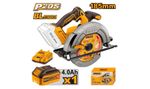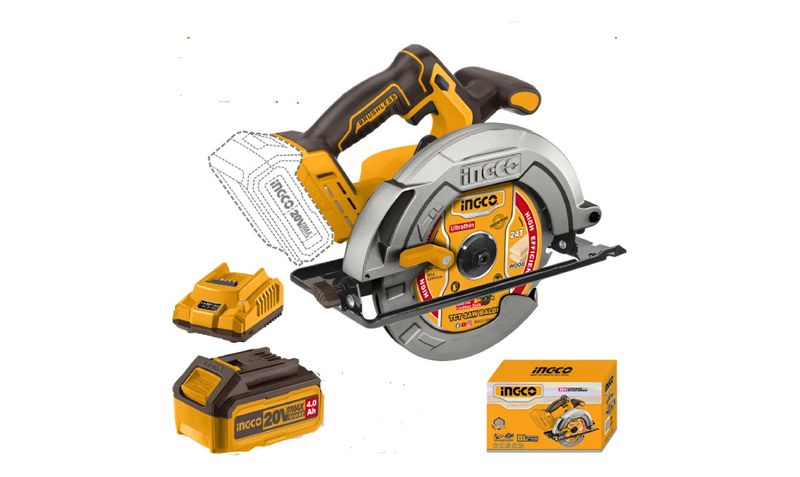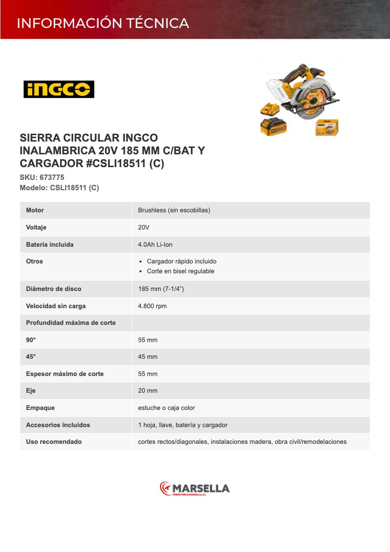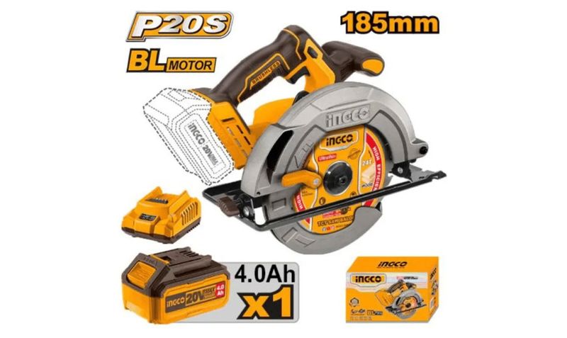 Sierra circular inalámbrica INGCO CSLI18511 con motor sin escobillas (brushless) de 20V, diseñada para cortes precisos en madera, tableros, melamina y plásticos. Incluye batería Li-Ion 20V 4.0Ah y cargador rápido, hoja de 185mm, profundidad y corte en bisel regulables. Ideal para trabajos profesionales y uso móvil.